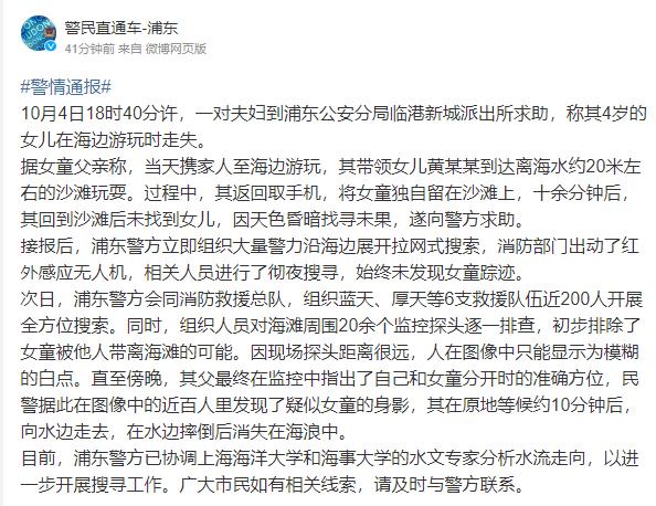 接報(bào)后,浦東警方立即組織大量警力沿海邊展開拉網(wǎng)式搜索,消防部門出動(dòng)了紅外感應(yīng)無(wú)人機(jī),相關(guān)人員進(jìn)行了徹夜搜尋,始終未發(fā)現(xiàn)女童蹤跡。