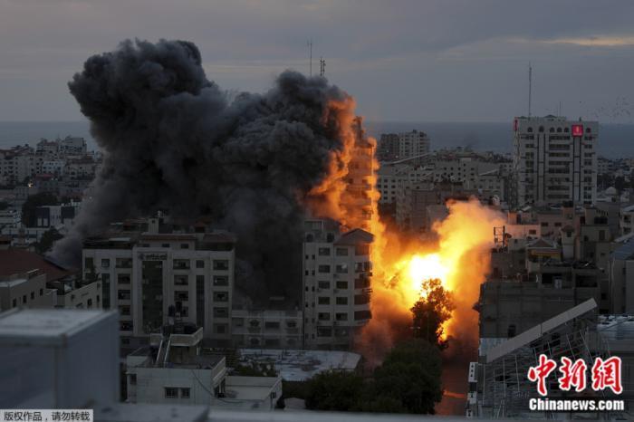 當(dāng)?shù)貢r(shí)間10月7日,以色列空襲加沙地帶,一座巴勒斯坦公寓大樓爆炸,火球和煙霧上升。