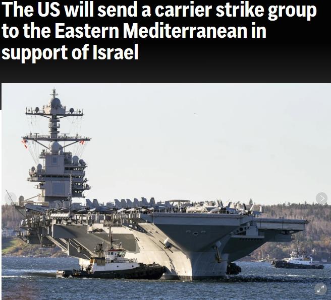 據(jù)美聯(lián)社報(bào)道,當(dāng)天,美國(guó)國(guó)防部長(zhǎng)奧斯汀發(fā)表聲明稱,他下令“杰拉爾德·R·福特”號(hào)航空母艦戰(zhàn)斗群移至更靠近以色列的東地中海,包括一艘航空母艦、一艘導(dǎo)彈巡洋艦和四艘導(dǎo)彈驅(qū)逐艦,以展示武力,準(zhǔn)備應(yīng)對(duì)任何情況,這些情況包括阻止更多武器送達(dá)巴勒斯坦伊斯蘭抵抗運(yùn)動(dòng)(哈馬斯)以及進(jìn)行監(jiān)視。