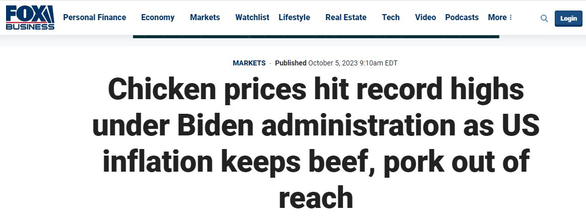 另?yè)?jù)美國(guó)??怂股虡I(yè)頻道(Fox Business)網(wǎng)站報(bào)道,受到持續(xù)通貨膨脹影響,美國(guó)牛肉和豬肉價(jià)格保持高位,普通消費(fèi)者不得不轉(zhuǎn)向略微便宜一些的雞肉。然而,全美零售店的雞肉價(jià)格也隨著需求量的增加而水漲船高,更是創(chuàng)下歷史新高,并且預(yù)計(jì)還將保持在高位。