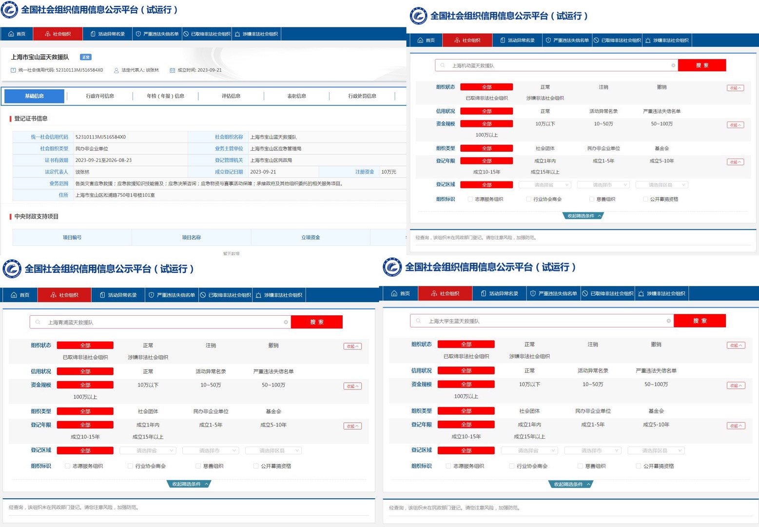 中新網(wǎng)查詢?nèi)珖鐣M織信用信息公示平臺發(fā)現(xiàn),上海市寶山藍(lán)天救援隊(duì)成立登記日期為2023年9月21日,系民辦非企業(yè)單位,業(yè)務(wù)主管單位為上海市寶山區(qū)應(yīng)急管理局。其余3個組織顯示為“該組織未在民政部門登記,請您注意風(fēng)險(xiǎn),加強(qiáng)防范”。