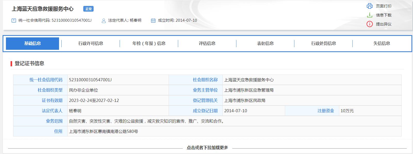 企查查信息顯示,上海藍(lán)天應(yīng)急救援服務(wù)中心成立于2014年,法人為楊春明。全國社會組織信用信息公示平臺顯示,其成立登記日期為2014年7月10日,系民辦非企業(yè)單位,登記管理機(jī)關(guān)為上海市浦東新區(qū)民政局。
