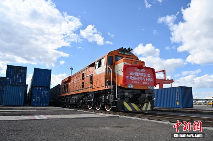 資料圖:2023年9月20日,在內蒙古滿洲里站集裝箱場,X8102次回程中歐班列,編組53輛,載滿板材、汽車配件、食品等貨品,開往西安國際港。