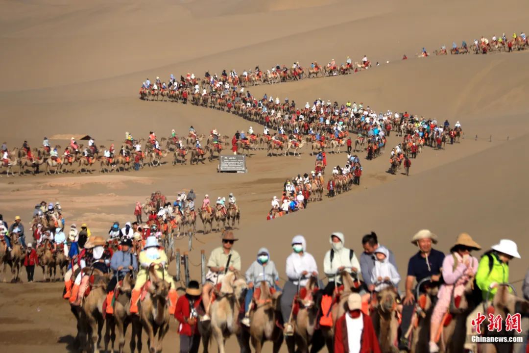 2023年7月,游客在甘肅省敦煌市鳴沙山月牙泉景區(qū)游覽。張曉亮 攝