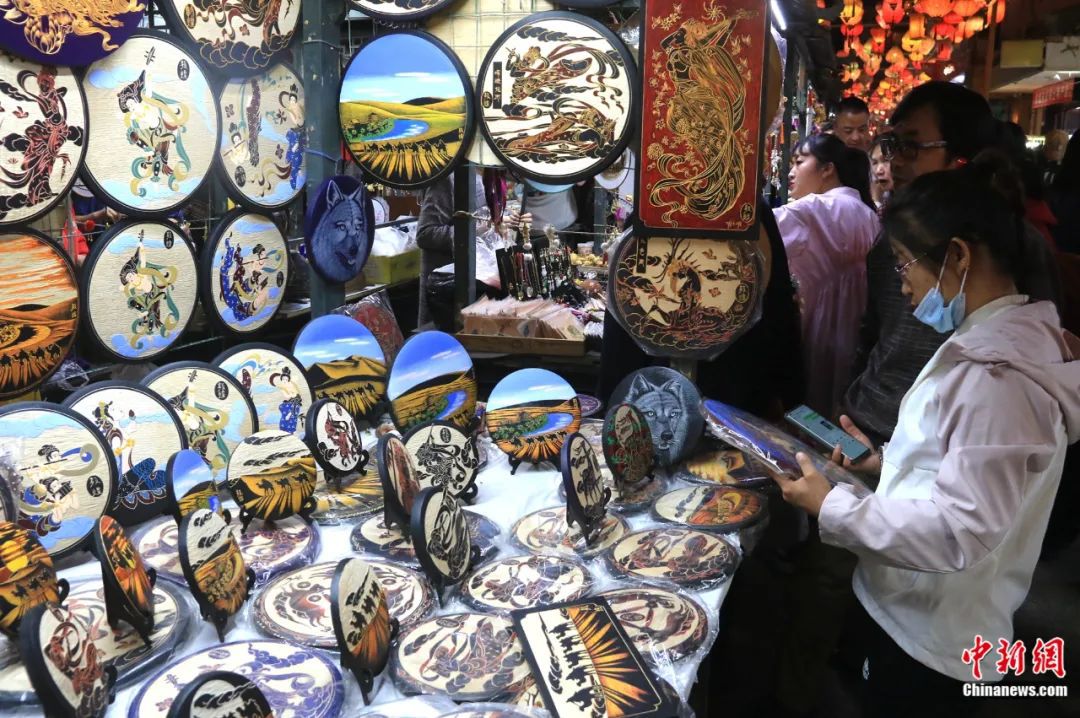 游客在敦煌夜市選購(gòu)敦煌木雕畫(huà)。張曉亮 攝
