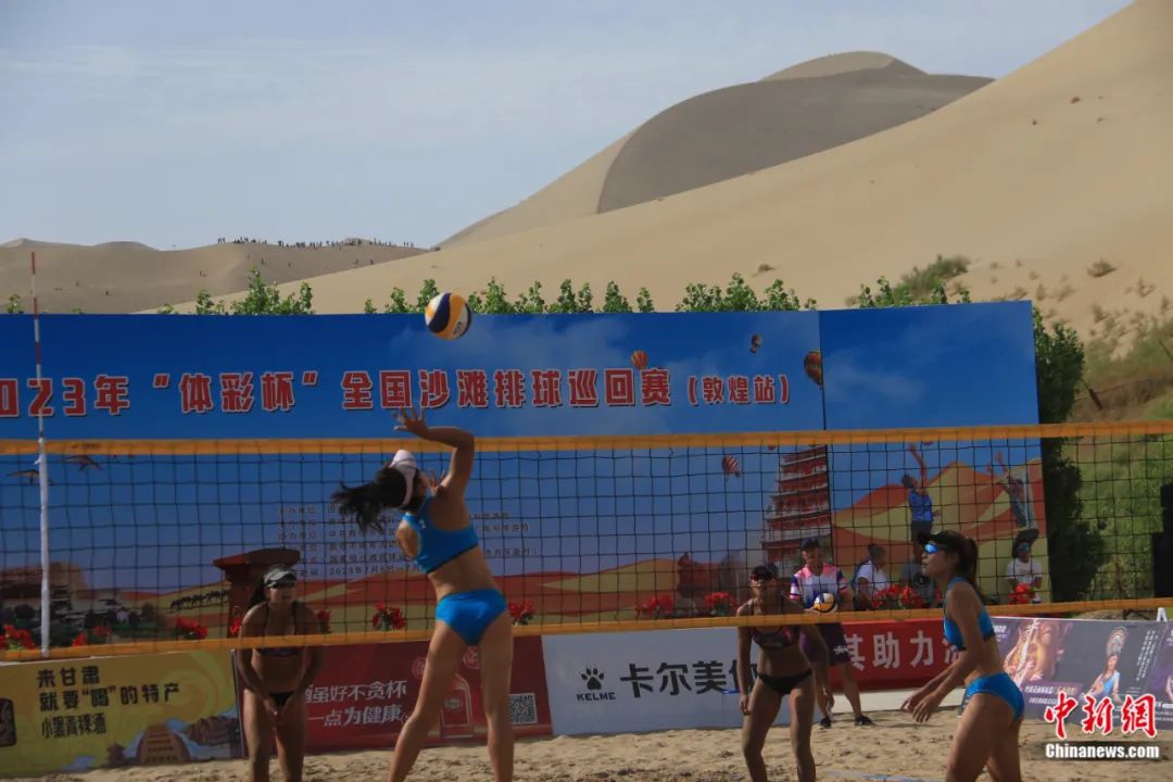 2023年“體彩杯”全國(guó)沙灘排球巡回賽(敦煌站),在鳴沙山下開(kāi)賽。張曉亮 攝