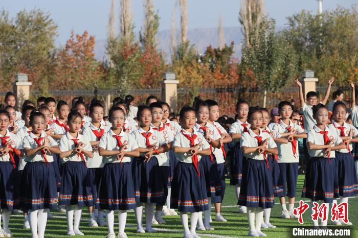 10月13日,在敦煌文化進(jìn)校園暨敦煌文化校服展示活動上,當(dāng)?shù)貙W(xué)生展示“敦煌文化校服”。周斌全攝