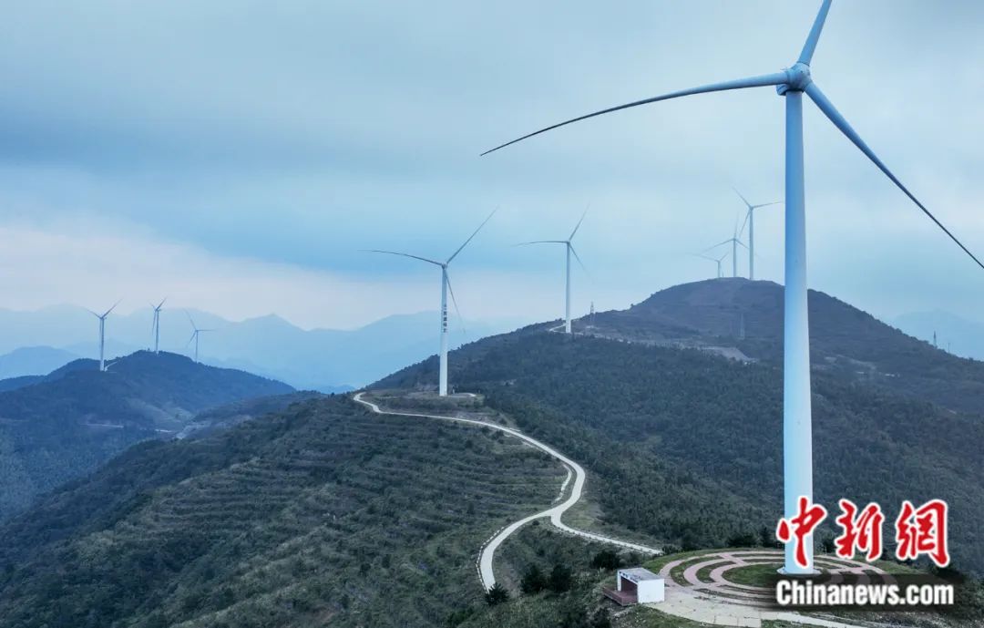 臺(tái)州市仙居縣廣度鄉(xiāng)風(fēng)力發(fā)電機(jī)。(無(wú)人機(jī)照片)陳月明 攝