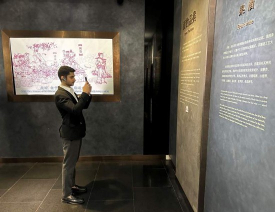 10月23日,2023“一帶一路”媒體合作論壇聯(lián)合采訪團(tuán)團(tuán)員在中國(guó)酒文化城認(rèn)真觀看展覽。本報(bào)記者 劉書(shū)文攝
