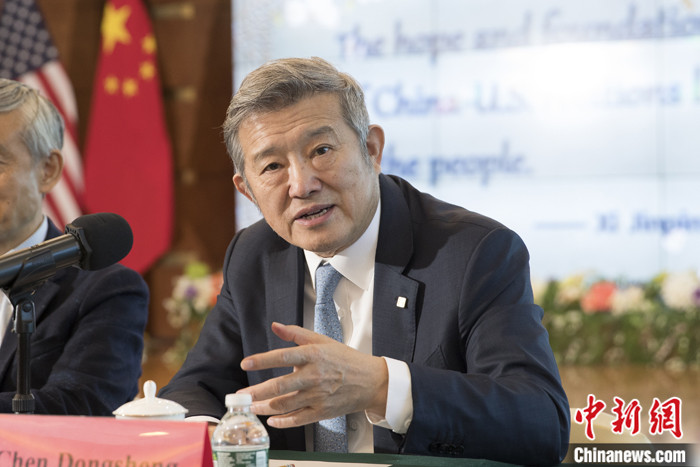 當?shù)貢r間10月25日,參加清華大學和美中關系全國委員會共同舉辦的“中美民眾對話”活動的部分代表來到中國駐紐約總領事館,就中美經貿關系、科研合作、人文交流等回答記者提問。被問及中國企業(yè)在美國投資的相關問題時,泰康保險集團董事長陳東升表示,貿易和投資對中美關系十分重要。在美國投資,比如康復醫(yī)療是一個大的合作方向,我們歡迎美國的企業(yè)來合作,這是互利互惠的過程。 中新社記者 廖攀 攝