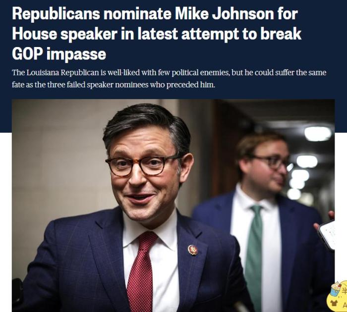 法新社還指出,約翰遜是共和黨在大約兩周內,所提名的第四位眾議院議長候選人,凸顯這個“分裂的”的政黨陷入了混亂。