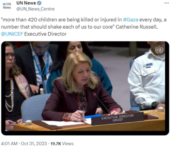 中新網(wǎng)10月31日電 據(jù)聯(lián)合國新聞消息,當?shù)貢r間30日,聯(lián)合國兒童基金會執(zhí)行主任凱瑟琳·拉塞爾表示,最新統(tǒng)計數(shù)據(jù)顯示,目前加沙地帶每天至少有420名兒童死亡和受傷。