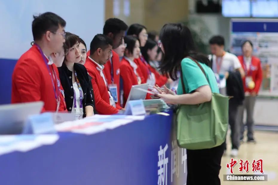 11月4日,位于上海國(guó)家會(huì)展中心的進(jìn)博會(huì)新聞中心正式啟用,志愿者在新聞中心為記者服務(wù)。中新社記者 盛佳鵬 攝