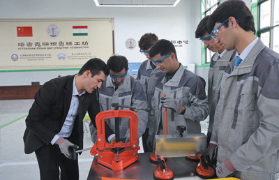 2022年,中亞地區(qū)首家魯班工坊在塔吉克斯坦啟動運營,為塔吉克斯坦開展職業(yè)培訓作出了積極貢獻。圖為今年4月,在塔吉克斯坦魯班工坊,塔方教授向學生介紹中方捐贈的設備。