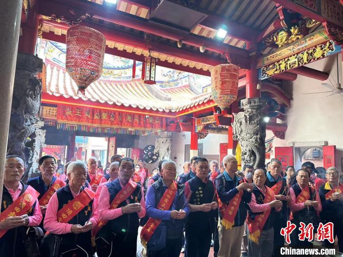 圖為18日臺(tái)灣參訪團(tuán)一行人在福建漳州市薌城區(qū)的頂田霞正順廟進(jìn)香祭拜。頂田霞正順廟供圖