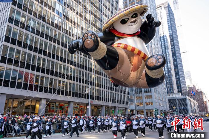 當(dāng)?shù)貢r間11月23日,第97屆梅西百貨感恩節(jié)大游行在美國紐約曼哈頓舉行。圖為基于動畫電影《功夫熊貓》里阿寶的造型設(shè)計的巨型氣球行進在曼哈頓街頭。 中新社記者 王帆 攝