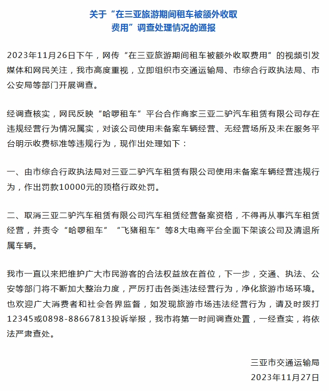 經(jīng)調(diào)查核實(shí),網(wǎng)民反映“哈啰租車”平臺(tái)合作商家三亞二驢汽車租賃有限公司存在違規(guī)經(jīng)營(yíng)行為情況屬實(shí),對(duì)該公司使用未備案車輛經(jīng)營(yíng)、無(wú)經(jīng)營(yíng)場(chǎng)所及未在服務(wù)平臺(tái)明示收費(fèi)標(biāo)準(zhǔn)等違規(guī)行為,現(xiàn)作出處理如下: