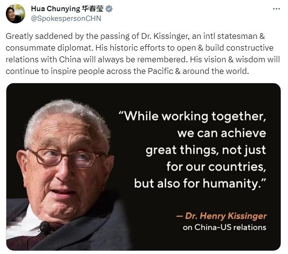 中新網(wǎng)11月30日電 當?shù)貢r間11月29日,美國前國務卿基辛格逝世。對此,中國外交部部長助理華春瑩在社交平臺上發(fā)文稱,基辛格是一位國際政治家和杰出的外交家。我們將永遠銘記他為建立同中國的建設性關系所作的歷史性努力。