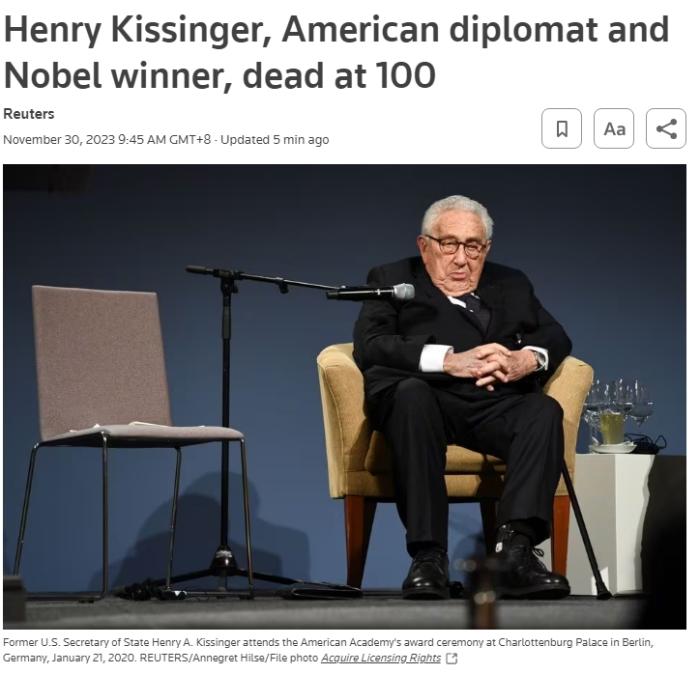 中新網(wǎng)11月30日電 據(jù)基辛格協(xié)會的消息,當?shù)貢r間11月29日,美國前國務(wù)卿基辛格在其位于康涅狄格州的家中去世,享年100歲。