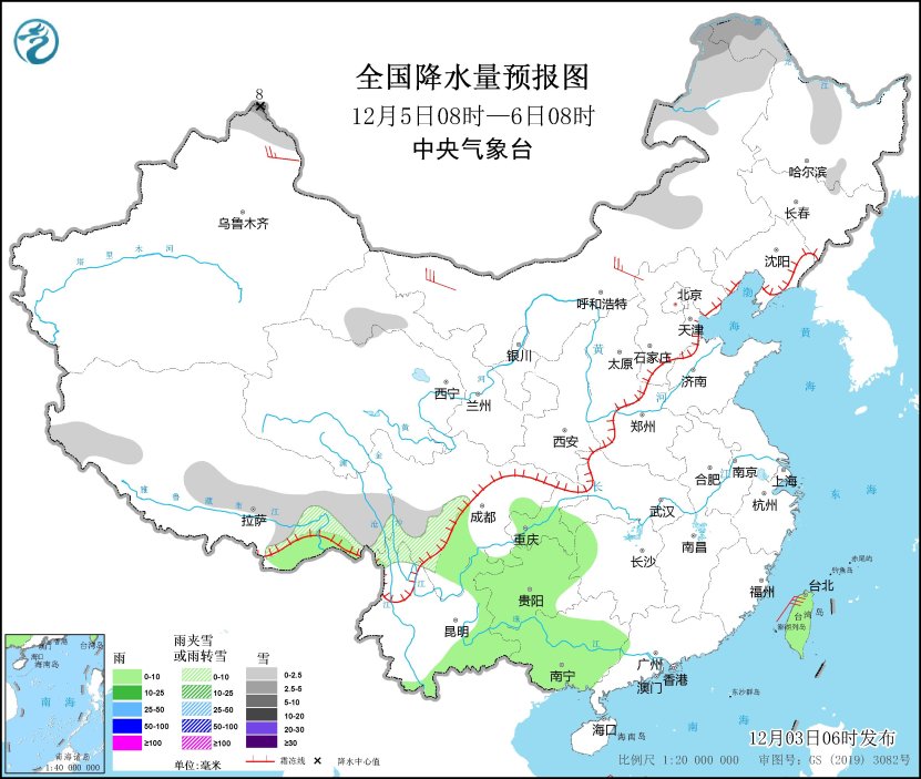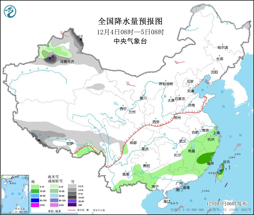 12月3日08時(shí)至4日08時(shí),新疆北部、內(nèi)蒙古東北部、黑龍江西北部、西藏西南部和東部、川西高原等地部分地區(qū)有小到中雪或雨夾雪,其中,新疆北疆北部等地部分地區(qū)有大到暴雪,局地大暴雪或特大暴雪(30~35毫米)。江南、西南地區(qū)東部和南部、華南北部和西部、臺(tái)灣島等地部分地區(qū)有小雨,其中,湖南南部、江西中南部、福建中部、廣西東北部、臺(tái)灣島中北部等地部分地區(qū)有中雨。內(nèi)蒙古中西部等地部分地區(qū)有4~6級(jí)風(fēng)。
