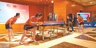 中美乒乓球運(yùn)動員進(jìn)行表演賽。