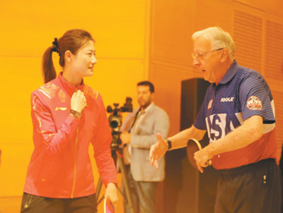 美國乒乓球名宿戴爾·斯威里斯與中國乒乓球名將丁寧在交流球技。