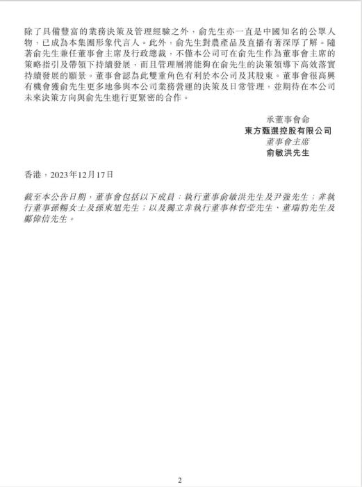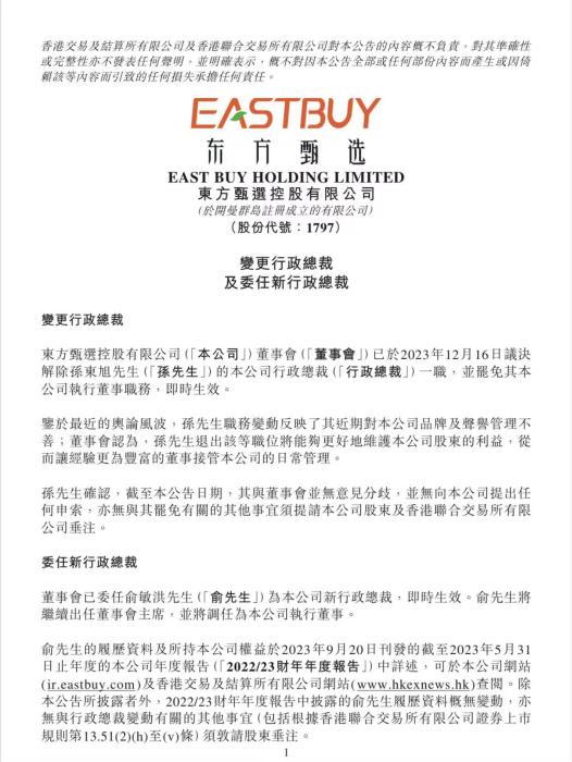 中新網(wǎng)12月18日電 12月18日,東方甄選開盤后股價(jià)大漲,截至發(fā)稿時(shí),漲超10%。當(dāng)日凌晨,東方甄選微博賬號發(fā)布的直播預(yù)告海報(bào)顯示,董宇輝的身份已成為“東方甄選高級合伙人”。12月17日,東方甄選發(fā)布公告稱,董事會已于12月16日議決解除孫東旭的行政總裁一職,并罷免其公司執(zhí)行董事職務(wù),即時(shí)生效。(中新財(cái)經(jīng))