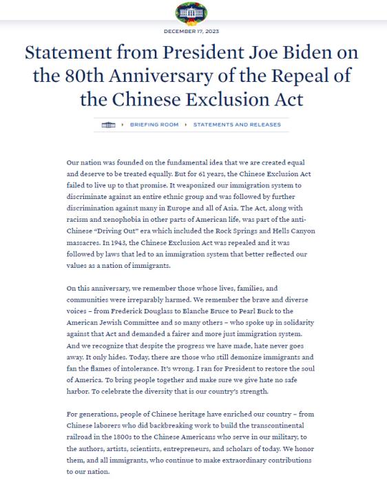當(dāng)?shù)貢r(shí)間2023年12月17日,薛海培終于等到了白宮的文告。美國(guó)總統(tǒng)拜登在文告中指出,“人人生而平等,應(yīng)該受到平等對(duì)待”,但《排華法案》與這一理念背道而馳,“它將我們的移民制度武器化,歧視整個(gè)種族群體,隨后又進(jìn)一步歧視歐洲和整個(gè)亞洲的許多人?!?/p>