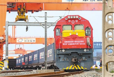 4月26日,成都國(guó)際班列十周年紀(jì)念專列暨首列“法國(guó)郵政DPD號(hào)”發(fā)車儀式在成都國(guó)際鐵路港舉行。