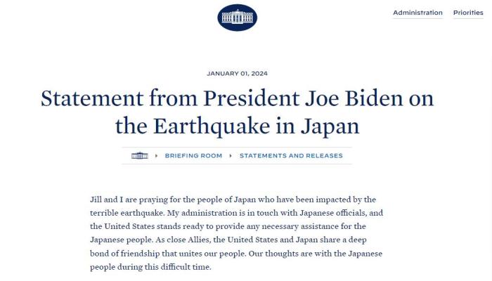 聲明稱,美國總統(tǒng)拜登和第一夫人吉爾“正在為遭受可怕地震影響的日本人民祈禱。拜登政府正與日本官員保持聯(lián)系,美國隨時準備為日本民眾提供任何必要的援助?!?/p>