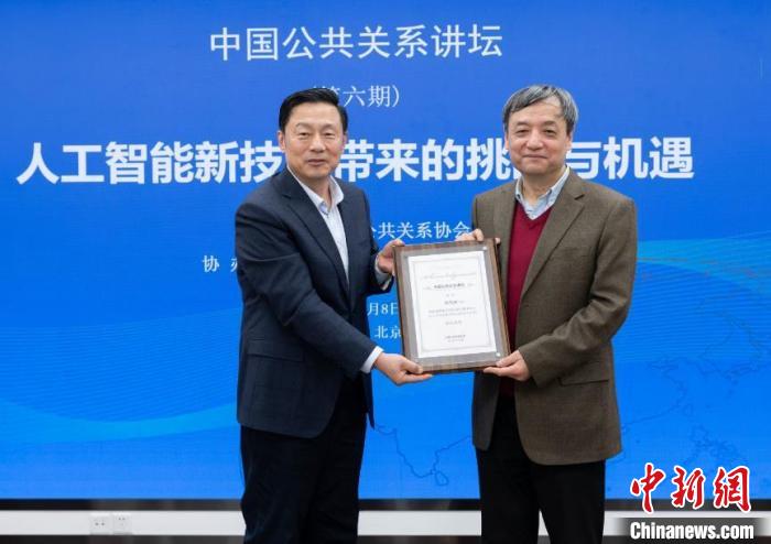 1月8日,中國公共關系講壇在北京舉行。圖為講壇結束后,中國公共關系協(xié)會會長郭衛(wèi)民(左)向演講嘉賓、清華大學人工智能研究院常務副院長孫茂松頒發(fā)榮譽證書。 中國公共關系協(xié)會供圖。
