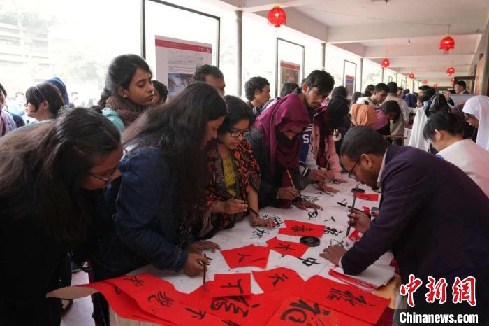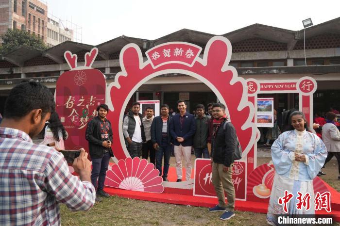 此次活動,受到達(dá)卡大學(xué)師生及當(dāng)?shù)孛癖姷臍g迎。數(shù)百份“?!弊帧⒋郝?lián)、年畫、中國結(jié)、燈籠,營造濃濃的節(jié)日氛圍;近3000人次學(xué)生體驗寫福字、穿漢服等傳統(tǒng)文化;精彩的舞獅表演贏得陣陣喝彩;“恭賀新春”打卡區(qū)更是排起長龍……