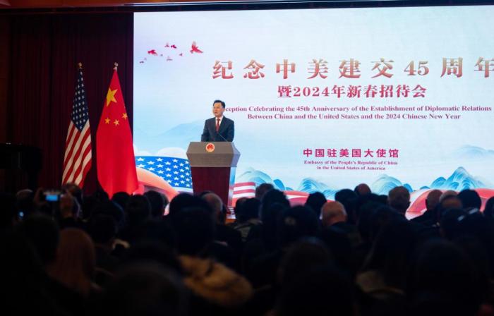 當(dāng)?shù)貢r(shí)間1月16日晚,中國駐美國使館隆重舉辦紀(jì)念中美建交45周年暨新春招待會(huì)。謝鋒大使出席并發(fā)表致辭。