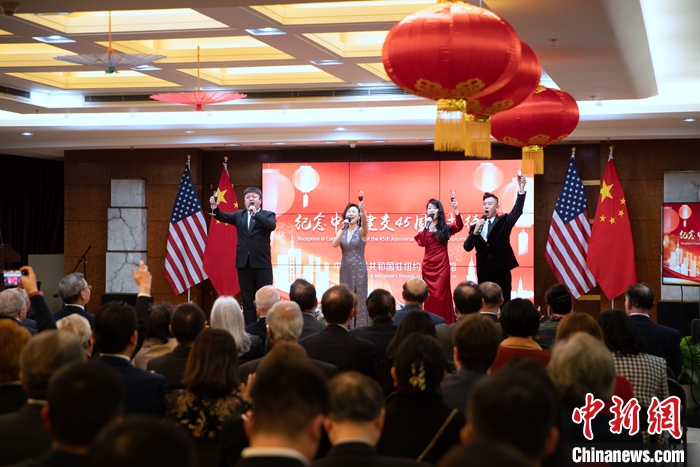 當?shù)貢r間1月17日,中國駐紐約總領(lǐng)館舉行中美建交45周年招待會。圖為現(xiàn)場表演美聲聯(lián)唱《為祖國干杯》《飲酒歌》。 中新社記者 廖攀 攝