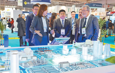2023年11月在法國巴黎舉辦的第五屆世界核能工業(yè)博覽會上,中國核工業(yè)集團工作人員在向法國原子能委員會負責(zé)人介紹展出內(nèi)容。