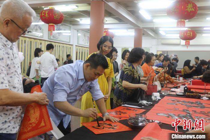 印尼書法愛(ài)好者揮毫迎甲辰龍年新春