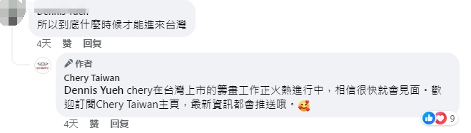 早前,奇瑞官方在臉書創(chuàng)立“Chery Taiwan”,并從去年開始更新專業(yè)內(nèi)容,針對一款中型運動型多用途汽車已多次發(fā)布宣傳影片。有不少臺灣網(wǎng)友在該賬號咨詢該款汽車何時會在臺灣上市,該賬號回復,目前在臺灣上市的籌劃工作正火熱進行中,相信很快就會見面。