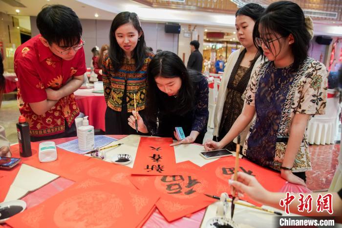2月3日,廣西民族大學舉辦留學生春節(jié)團拜會活動。圖為留學生在寫春聯(lián)。陳冠言 攝