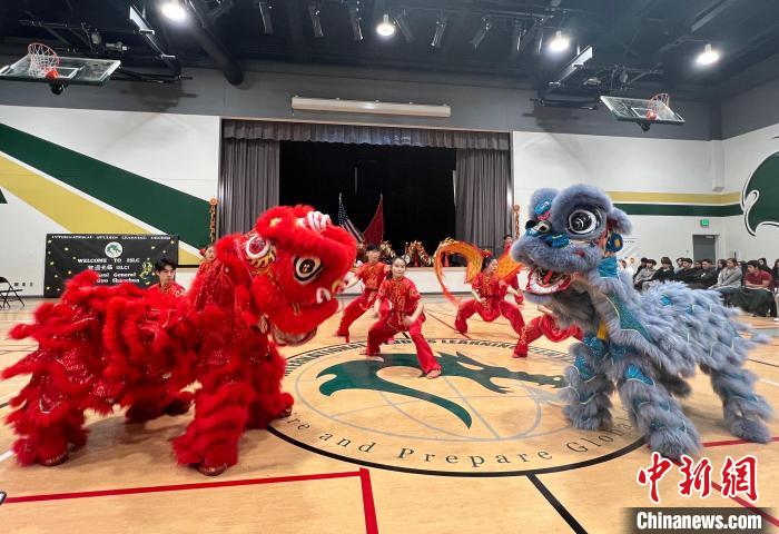 當?shù)貢r間2月5日下午,中國人民大學(xué)附屬中學(xué)藝術(shù)團在美國洛杉磯國際研究學(xué)習(xí)中心進行交流演出。圖為武術(shù)《龍騰虎躍》。 中新社記者 張朔 攝