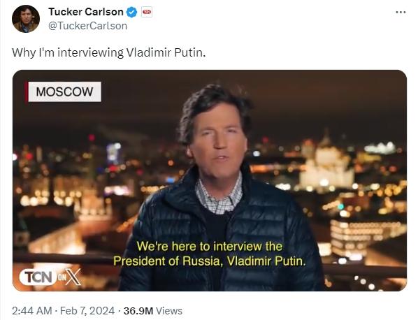 據(jù)介紹,卡爾森是福克斯電視臺的一名當(dāng)紅主播,主要負(fù)責(zé)一檔名為《卡爾森今夜秀》的新聞節(jié)目。他在2023年4月被??怂菇夤?,隨后在社交平臺X上繼續(xù)發(fā)布采訪節(jié)目。路透社稱,卡爾森2023年8月在X上發(fā)布的對美國前總統(tǒng)特朗普的采訪獲得了上億播放量。