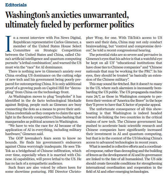 吉門(mén)尼斯擺出一副對(duì)中國(guó)科技迅速發(fā)展憂心忡忡的樣子,這在華盛頓并不新鮮,是國(guó)會(huì)山反華政客為一己之私推動(dòng)在科技脫鉤、破壞國(guó)際科技合作的又一例證。
