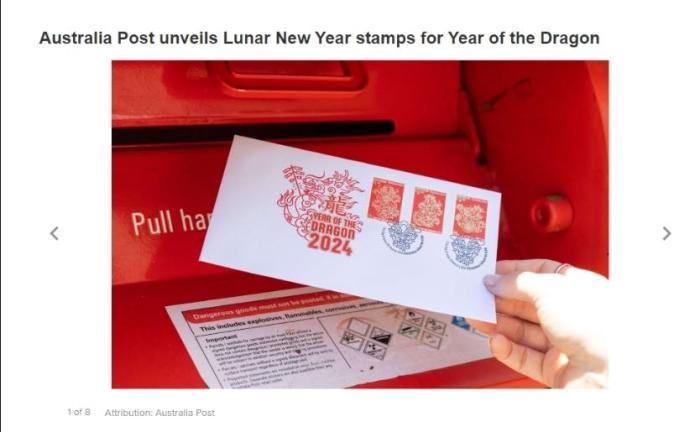 圖片澳大利亞郵政近日推出了龍年特別版中國春節(jié)郵票。圖為澳大利亞第九新聞網(wǎng)站截圖