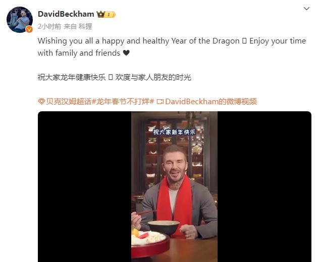 視頻中,貝克漢姆表示,“今年是特別的一年——龍年”,并用中文說(shuō)道“新春快樂(lè)!”隨后,他用筷子吃起了面條。