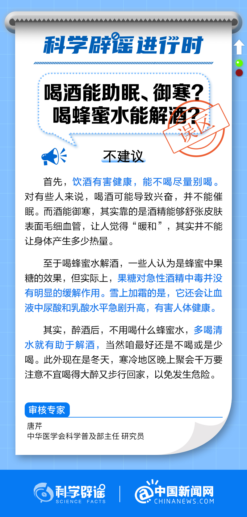 中新網(wǎng)2月13日電 飲酒有害健康,能不喝盡量別喝。對(duì)有些人來(lái)說(shuō),喝酒可能導(dǎo)致興奮,并不能催眠。而酒能御寒,靠的是酒精能夠舒張皮膚表面毛細(xì)血管,讓人覺得“暖和”,其實(shí)并不能讓身體產(chǎn)生多少熱量。至于喝蜂蜜水解酒,一些人認(rèn)為是蜂蜜中果糖的效果,但實(shí)際上,果糖對(duì)急性酒精中毒并沒有明顯的緩解作用。它還會(huì)讓血液中尿酸和乳酸水平急劇升高,有害人體健康。(來(lái)源:@科學(xué)辟謠 中國(guó)新聞網(wǎng)微博 )