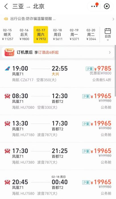 中新財經(jīng)記者14日晚間查詢發(fā)現(xiàn),2月15日至2月19日,???、三亞以及瓊海直飛北京和上海兩大目的地的經(jīng)濟艙機票均已售罄。15日至17日的回程高峰期,公務(wù)艙機票價格集中在萬元上下。17日當(dāng)天,從三亞直飛北京的公務(wù)艙機票價格最高已接近兩萬元。