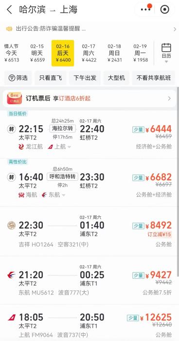 這個冬天,“爾濱”出圈,帶動?xùn)|北旅游熱。16日至17日,從哈爾濱、沈陽直飛北京、上海的機票只剩高價公務(wù)艙,長春直飛這兩大目的地的機票僅余少量經(jīng)濟艙。其中,哈爾濱飛往上海的部分公務(wù)艙價格已經(jīng)上萬,哈爾濱飛往其他熱門目的地的機票價格也動輒五六千元。
