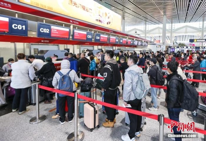 2月8日,海南???,旅客在??诿捞m國際機場T2航站樓排隊辦理值機。春節(jié)臨近,??诿捞m國際機場客流攀升。中新社記者 駱云飛 攝