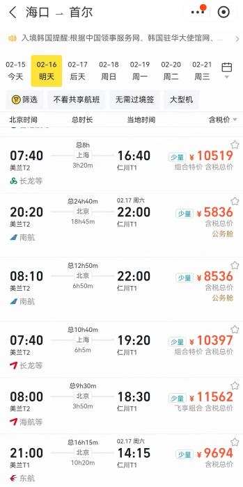 在社交平臺上,一些網(wǎng)友還提供了“聯(lián)程甩尾”方案。例如,從??谥憋w北京,16日票價要近萬元,但如果選擇??陲w往首爾,從北京中轉(zhuǎn),票價最低僅需五千多元。