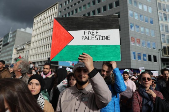 2023年10月22日,示威者在比利時布魯塞爾歐盟總部附近舉行集會,聲援巴勒斯坦。新華社記者趙丁喆攝