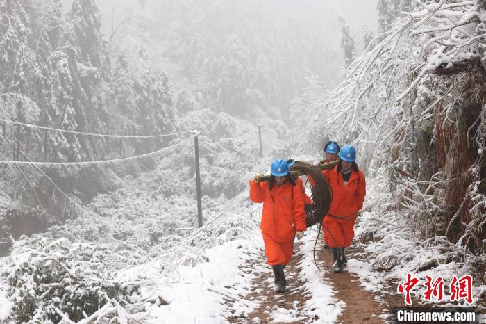2月8日,國(guó)網(wǎng)浙江電力援湘搶險(xiǎn)隊(duì)員前往平江縣開(kāi)展搶修作業(yè),扛運(yùn)搶修物資?!±盥勎?攝